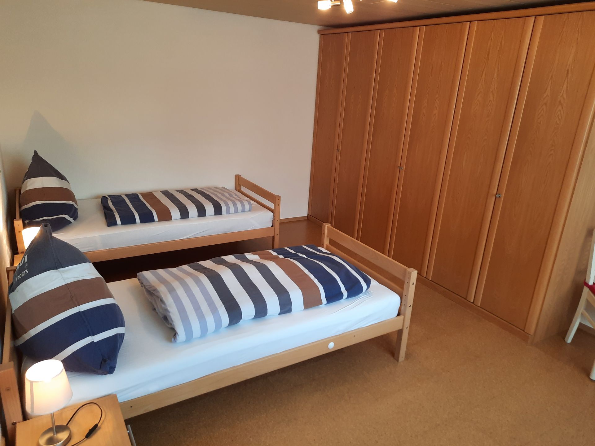 50 m² im EG, zwei Schlafzimmer (ein Zimmer mit zwei Betten, ein Zimmer mit einem Bett jew. 90x200cm), Bad mit Dusche, separates WC, Wohnküche mit Sofa, Fernseher, Esstisch und komplett ausgestatteter Küche.